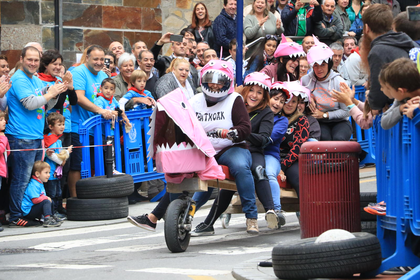 Los asistentes saben que cuando se escucha a lo lejos un silbato es que ha comenzado el descenso de una de las 'goitiberas' de las fiestas de Rontegi (Barakaldo). El público, que abarrota las calles, puede saber a distancia incluso si lo que baja es un artefacto de alta velocidad o estrambótico porque las exclamaciones se sienten desde lejos. "¡Ohhh!", se escucha en la sinuosa curva de las calles Nafarroa y Castilla La Mancha cuando aparece 'El Tiburón', la 'goitibera' múltiple que lleva a bordo a siete chicas del barrio, a la que se recibe entre aplausos y carcajadas. La cara es realmente de sorpresa y hasta susto cuando cruzan a la velocidad del rayo algunas de los vehículos diseñados para la ocasión y que amagan con chocar contra las balas de paja que protegen el recorrido. Los voluntarios de la comisión de fiestas realizan un sufrido trabajo para que nada salga mal. Con sus silbatos alertan de que llega la 'goitibera' y cada pocos metros se colocan para que ninguna se desvíe contra los bolardos y para que, si es necesario, reciban un poco de impulso extra en las zonas más llanas. Apenas ha terminado la bajada cuando los participantes ya piensan en la siguiente: en 12 meses, de nuevo en Rontegi.