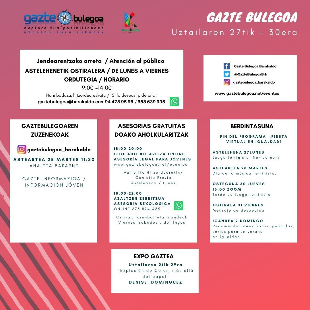 ☀️😎Hemen duzue Barakaldoko Gazte Bulegoaren azken programazioa udako oporrak baino lehen— GazteBulegoBarakaldo (@GazteBulegoaBrk) July 27, 2020
