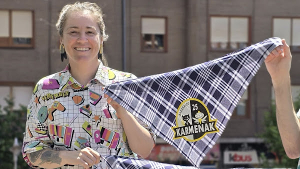 Barakaldo, 9 jul 2025. El Ayuntamiento de Barakaldo ha puesto a la venta el pañuelo de fiestas del Carmen de este año a un precio de 1,20 euros en un puesto en Herriko Plaza. La prenda incluye el diseño de las mascotas festivas, Jolín y Deabru, realizado por la autora del cartel anunciador, la zaragozana Pilar Montoya Lidoy, al que se añade el número 25, en referencia al año. Según la concejalía de Cultura (PNV), el pañuelo "se convierte en símbolo central de las celebraciones" este año.