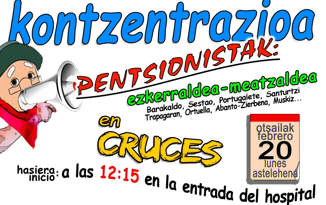 Zehazki, elkarretaratzea egingo da otsailaren 20an, astelehena, 12.15ean, Gurutzetako ospitalearen aurrean.